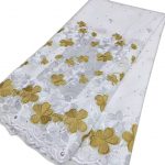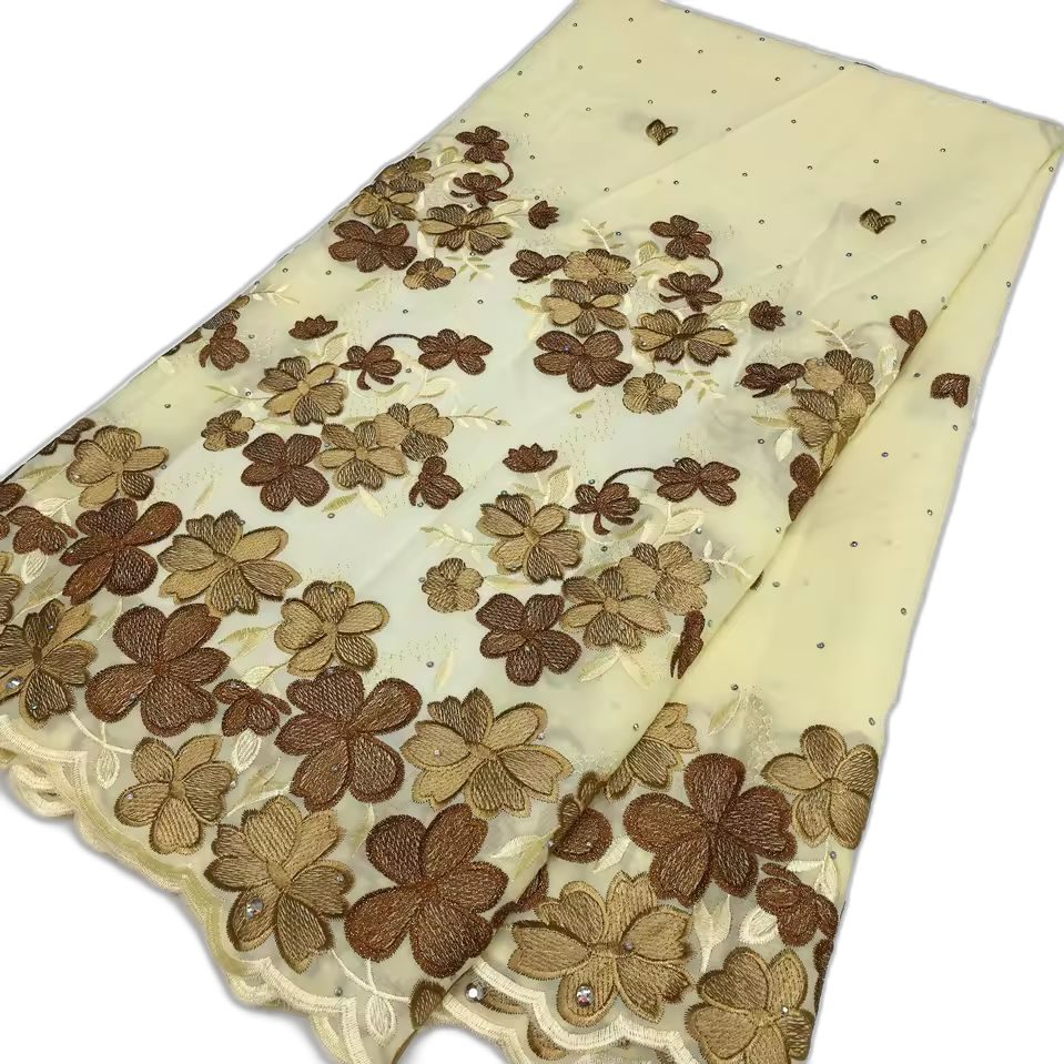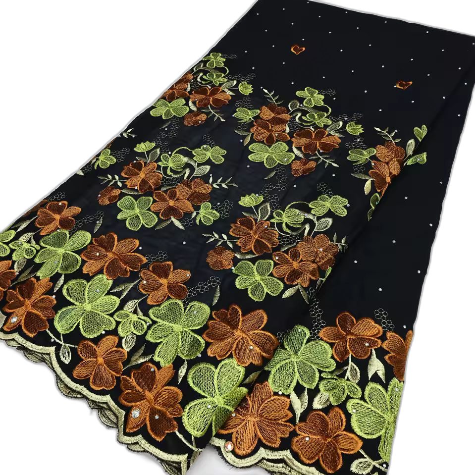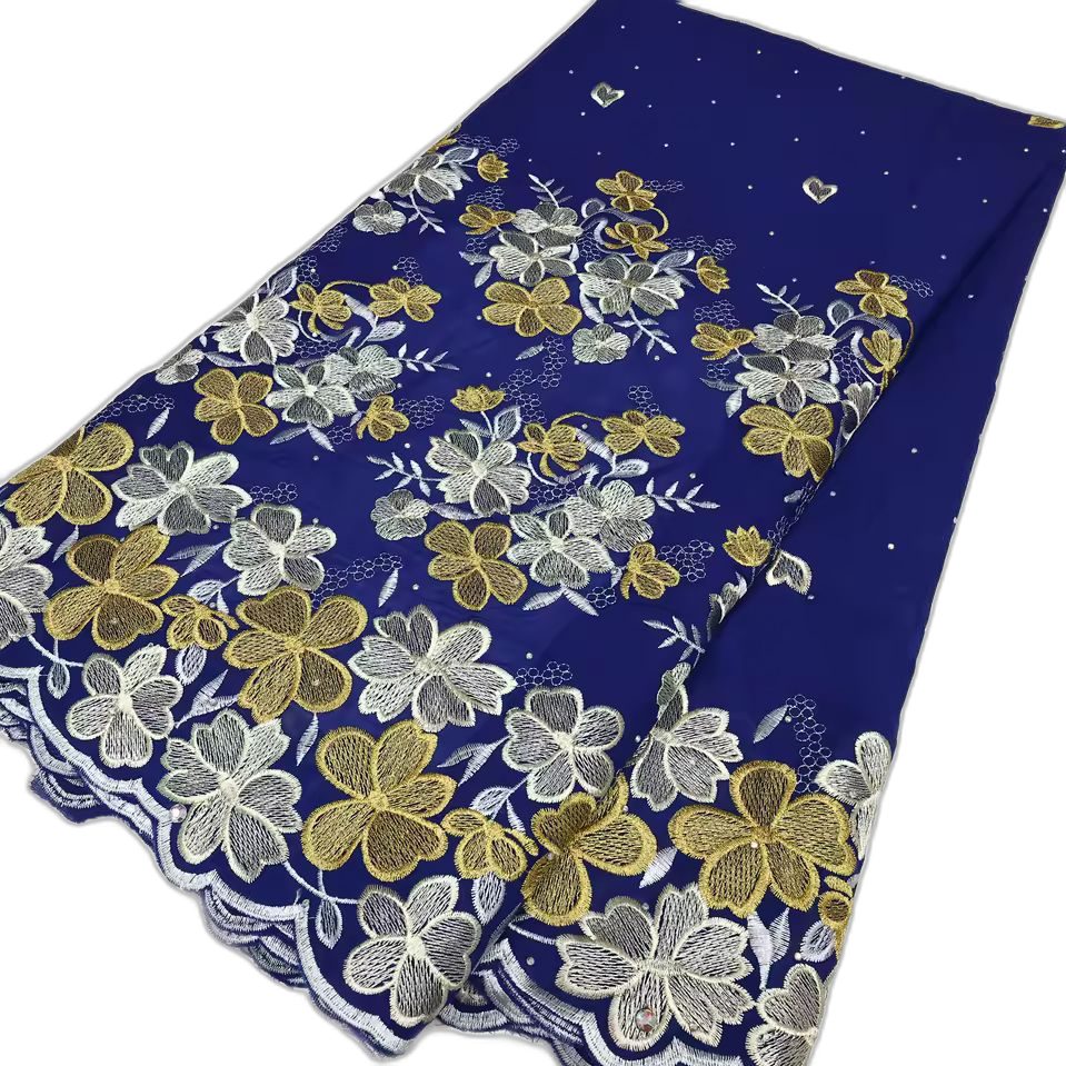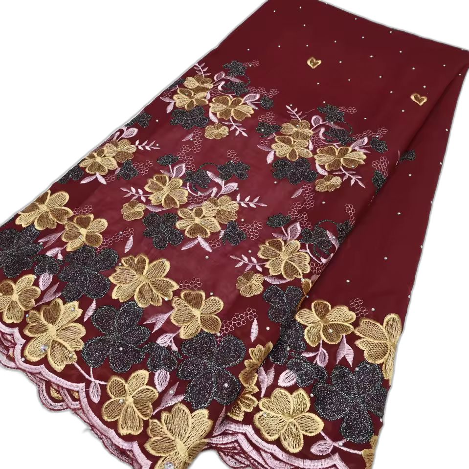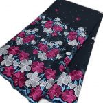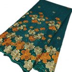 Magnifique tissu à la couleur intense, brodé de fleurs vives avec une base ondulée et des motifs scintillants. Idéal pour vos tenues traditionnelles ou élégantes.